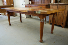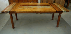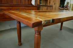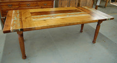 This is an example of a table designed by a client with 2" thick, wide old pine boards for the family beach house. The boards run the length of the table by 66" and then at both ends of the table 2 boards each side of 18" . The creativity of my clients is amazing and so the unique designs I offer, thanks to those clients, benefit us all. Everything I build is custom made so I can craft a table to the ideal size for your space, David
