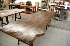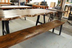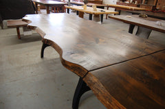 This table with its slab live edge features is a great example of our design capabilities. We have married the table with the old iron kick press industrial legs to create a really unique and organic form. We have also crafted benches with iron legs to complete this whole experience. The price of this table is $1450.00, the extension table is $415.00 and each bench is $375.00. The listed price of $1450.00 is for the table only. All our tables are custom made so call us for a quote,