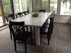 This table is a great example of a farm table built with old boards and finished in a washed white. The white finish is also sealed giving the excellent protection for one of our "everything" tables. Food and project remains just wash off with a damp cloth.