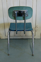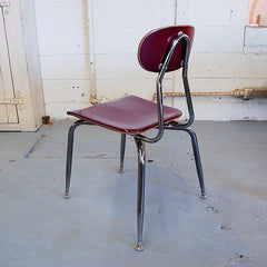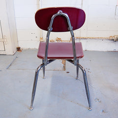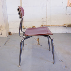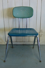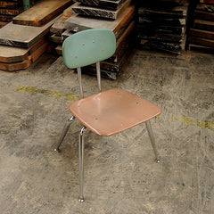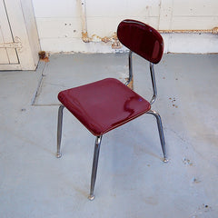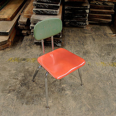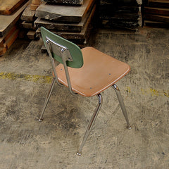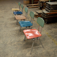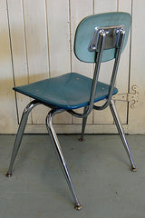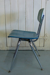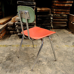 Vintage, mid-century schoolhouse chairs from the 1950s. Really well made, the seats and backs are made in maleimide resin, an extremely tough plastic. The legs are chromed steel with metal levelers. Built to withstand years of heavy use. We have 3 sizes: small, medium, and large. Multiple colors available. The chairs have a nice patina and do show some wear. Would look great in a kitchen, office, or restaurant space. Limited quantities.